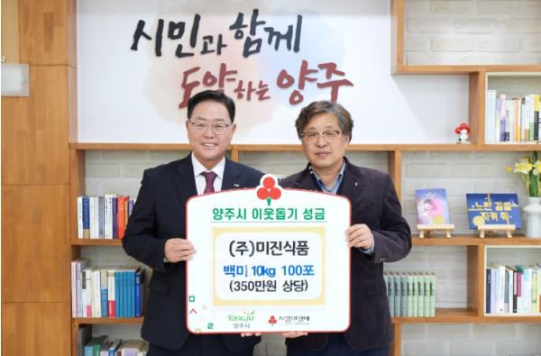 양주시가 지난 18일 ‘㈜미진식품’에서 시청을 방문해 지역 내 어려운 이웃을 위해 써달라며 백미 10kg 100포(환가액 350만 원 상당)를 기부했다고 밝혔다.
