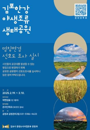 김포시에서는 김포한강야생조류생태공원이라는 공원이름을 시민들이 공감대를 형성할 수 있고 편하게 부를 수 있는 새로운 이름으로 정하기 위한 선호도 조사를 2월 19일부터 실시한다.