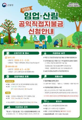 울진군은 2025년 임업·산림 공익직접지불금 신청·접수를 2025년 3월 1일부터 4월 30일까지 진행한다.