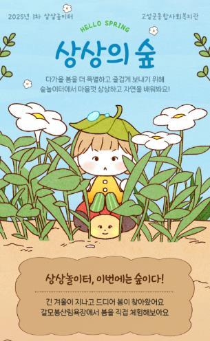 고성군은 3월 22일 진행 예정인 제1차 ‘상상놀이터: 상상의 숲’은 봄을 맞이하여 보호자 동반 아동을 대상으로 유아 숲 체험 특별프로그램을 진행한다.