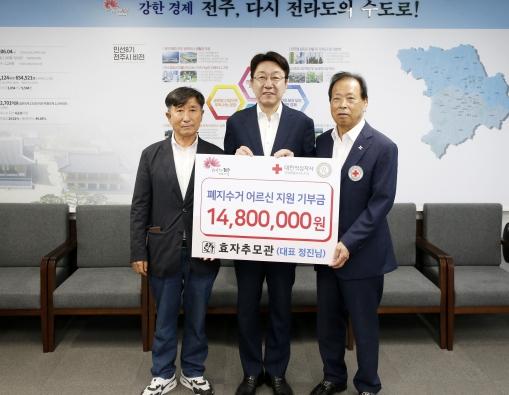 전주시는 12일 전주시청에서 정진 효자추모관 회장 등이 저소득 폐지 수거 어르신 74명에 1480만원 상당의 온누리상품권을 기부했다고 밝혔다.