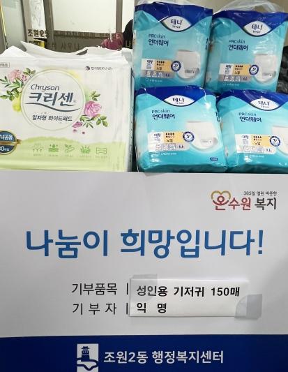 수원시 장안구 조원2동은 지난 5일, 익명의 기부자가 저소득 어르신들에게 전달해달라며 성인용 기저귀 150매를 기탁했다고 전했다.