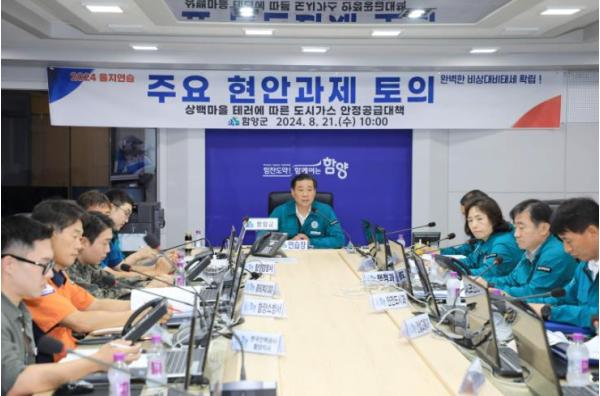 함양군은 21일 오전 10시 군청 재난종합상황실에서 진병영 군수 주재로 관계 공무원을 비롯해 소방서, 경찰서, 도시가스, 한전, KT 등 20여 명이 참석한 가운데 2024 을지연습 전시현안과제 토의 훈련을 개최했다.