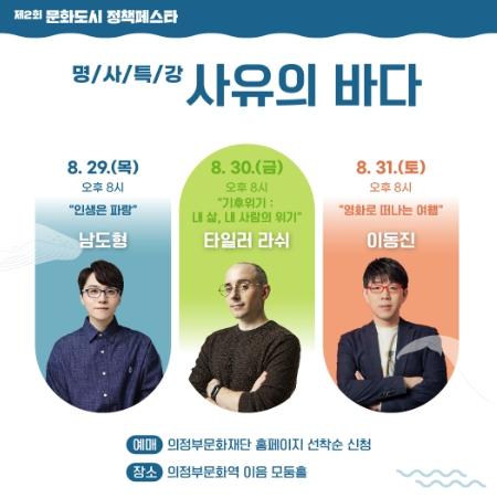 문화도시 정책페스타의 명사특강 프로그램 ‘사유의 바다’는 문화도시 의정부의 새로운 복합문화공간인 의정부문화역-이음의 모둠홀에서 진행될 예정이다