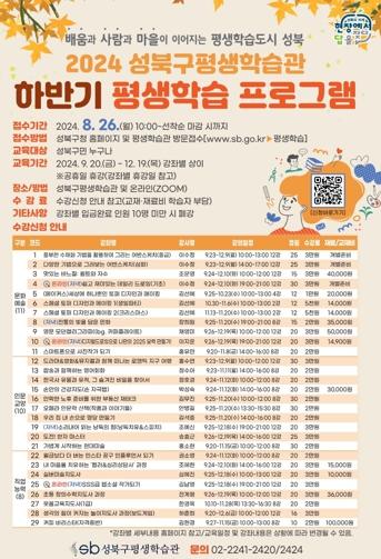 서울 성북구가 오는 26일 10시부터 성북구평생학습관 하반기 평생학습 프로그램 수강생을 선착순 모집한다.