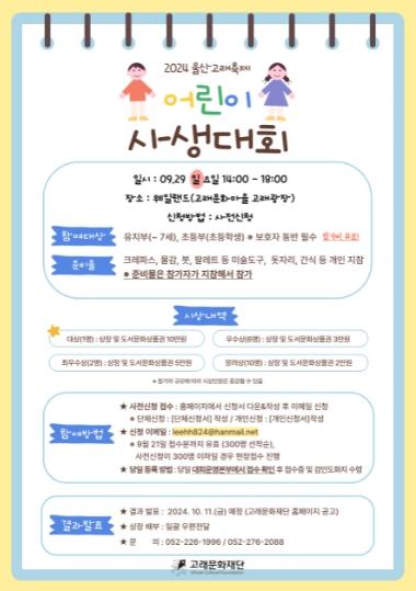 (재)고래문화재단(이사장 서동욱 울산남구청장)은 울산고래축제 기간에 어린이 사생대회를 열기로 하고 다음 달 21일까지 참가자를 모집한다고 밝혔다.