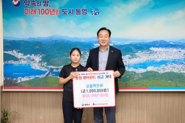 지난 10일 KBS 전국노래자랑 통영시편에 참가해 최우수상을 수상한 하수희 학생(제석초 6학년)이 시상금 일부(100만원)를 어려운 이웃을 위해 써달라며 통영시(시장 천영기)에 기탁했다.