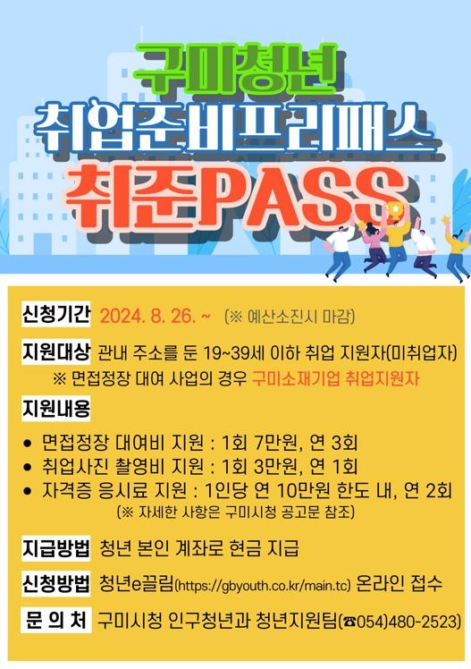 신청은 경북청년e끌림을 통해 가능하며, 문의사항은 구미시청 인구청년과(☎054-480-2523)로 하면 된다.