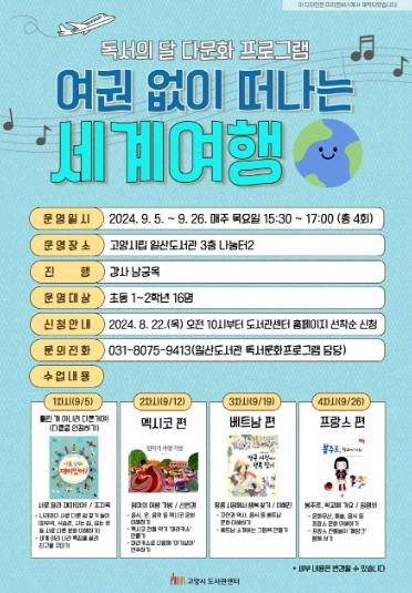 고양특례시 일산도서관은 9월 5일부터 초등 1~2학년 16명을 대상으로 다문화 프로그램 ‘여권 없이 떠나는 세계여행’을 운영한다.