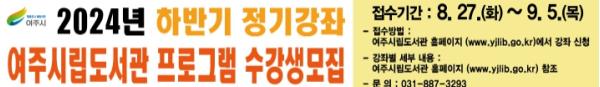 여주시 평생교육과 여주시립도서관은 2024년 8월 27일부터 9월 5일까지 하반기 정기강좌 수강생을 모집한다.