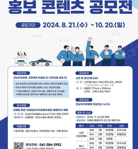 전라남도자치경찰위원회는 도민이 참여하는 자치치안 구현을 위해 오는 10월 20일까지 2024 전남자치경찰 홍보 콘텐츠 공모전을 개최한다고 밝혔다.