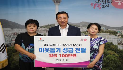 아리랑거리 먹자골목 상인회에서는 지난 22일 부산 중구를 방문하여 상인회 회원들이 정성들여 모은 이웃돕기 성금 100만원을 기탁했다.