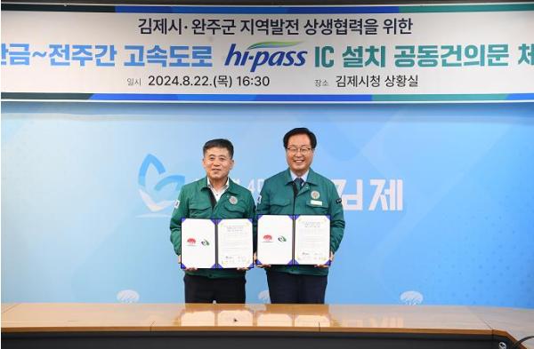 완주군과 김제시가 지역발전 상생협력사업으로 새만금-전주간 고속도로 하이패스IC(이서면과 용지면 경계) 설치를 위해 손을 맞잡았다.