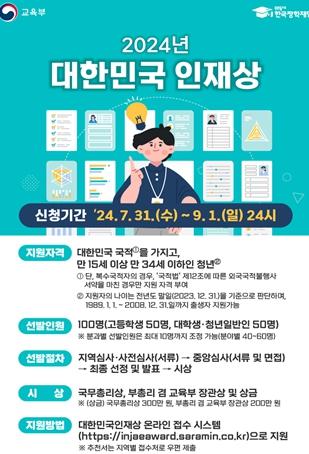 제주특별자치도는 ?2024 대한민국 인재상?에 추천할 제주지역 대학생과 청년 후보자를 오는 9월 1일까지 접수받고 있다.