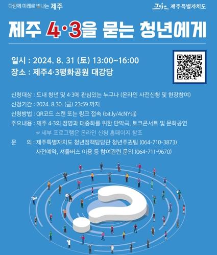 제주특별자치도는 제주청년들이 직접 기획한 '제주4?3을 묻는 청년에게'행사가 오는 31일 제주4?3평화공원 대강당에서 개최된다고 밝혔다.