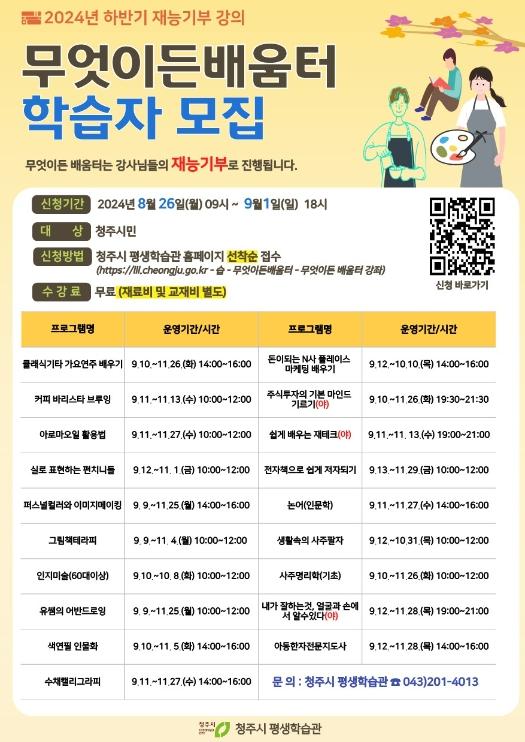 청주시 평생학습관은 2024년 하반기 ‘무엇이든 배움터’ 학습자를 모집한다고 23일 밝혔다.