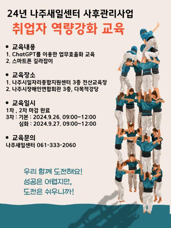 전라남도 나주시는 나주새일센터에서 구직자와 재직자들의 경쟁력 강화를 위한 ‘ChatGPT를 이용한 업무 효율화 교육’과 ‘누구나 쉽게 배우는 스마트폰 길라잡이 교육’을 새롭게 진행한다고 23일 밝혔다.