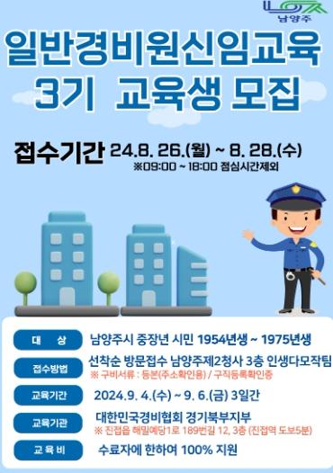 남양주시는 중장년 남양주시민을 대상으로 일반경비원 신임교육 3기 및 타일기능사 자격증 대비과정 교육생을 모집한다고 23일 밝혔다.