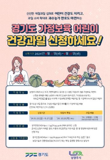 남양주시는 8월 23일부터 9월 27일까지 유치원, 어린이집 등 시설에 다니지 않고 가정에서 돌봄을 받는 미취학 아동을 대상으로 ‘가정보육 어린이 건강과일 공급사업’ 신청?접수를 받는다.
