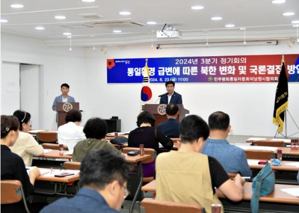 민주평화통일자문회의 남원시협의회는 8월 23일 오전 11시 문화예술지원센터에서 김영태남원시의회의장, 자문위원 등 50여명이 참석한 가운데‘통일환경 급변에 따른 북한변화 및 국론결집 방안’을 주제로‘2024년 3분기 정기회의’를 개최했다.