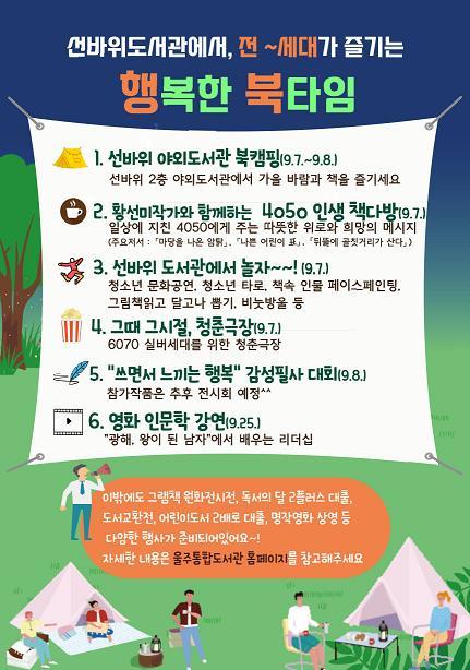 먼저 울주선바위도서관은 ‘선바위도서관에서 전 세대가 즐기는 행복한 북타임’을 주제로 작가 강연, 문화공연, 체험활동, 영화 상영 등 모든 연령층이 참여할 수 있는 15개 행사를 마련한다.