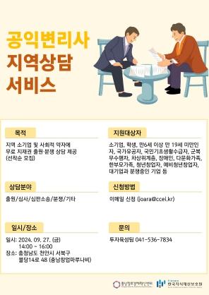 상·하반기 연 2회 개최되며, 하반기 상담 서비스는 9월 27일 14시~16시에 충남창업마루나비(충남 천안시 서북구 불당14로 48)에서 진행된다.