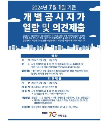 김포시는 2024년 7월 1일 기준 개별공시지가에 대해 가격산정과 감정평가사의 검증을 완료하고, 9월 2일에서 9월 23일까지 개별공시지가(안)에 대한 열람과 토지소유자 등의 의견을 받을 예정이다.
