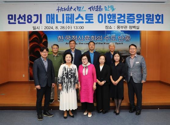 한편, 시는 28일 시청 청백실에서 매니페스토 이행검증위원회를 열고 민선 8기 2년간의 공약 이행상황을 평가했다. 이날 회의에는 공약 관련 전문가, 학자, 사회단체 대표, 주민 위원 등 매니페스토 이행검증위원회 위원 9명이 참석해 검증에 나섰다. 지난 2년간 추진한 109개 공약사업에 대해 계획의 적정성, 추진 과정의 효율성, 계획 대비 성과 달성률 등의 지표를 기준으로 평가했다. 평가 결과는 추후 안동시 누리집에 공개된다.