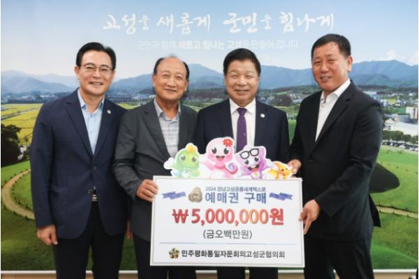 27일 고성군청 군수실에서 진행된 예매권 구매약정식에는 이상근 고성군수와 민주평화통일자문회의 고성군협의회(이도경 회장을 비롯한 관계자들이 참석해 진행됐으며 500만 원 상당의 엑스포 예매권을 구매하기로 약속하며, 엑스포의 성공개최를 위해 함께할 뜻을 밝혔다.