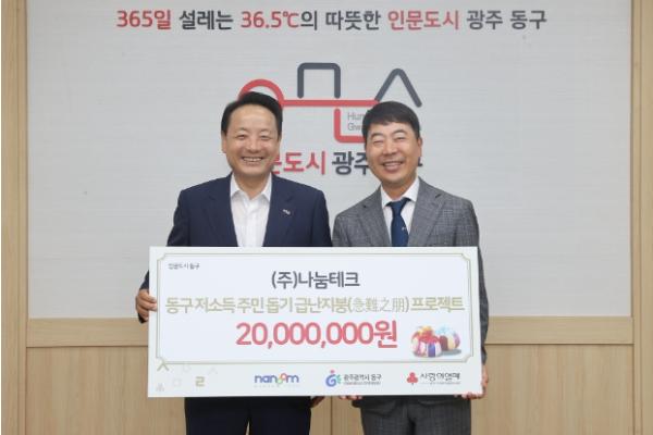 광주 동구는 29일 오전 ㈜나눔테크(대표 최무진)가 관내 어려운 이웃에 도움을 주고 싶다며 2천만 원을 기탁했다고 밝혔다.