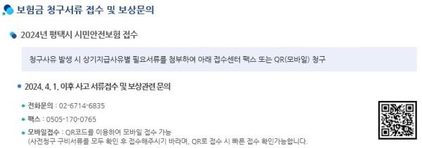 평택시민안전보험은 사고 당시 주소지가 평택시이며 사고 발생일이 보험가입기간 이내라면 다른 시?군으로 이사를 했더라도 사고발생일로부터 3년 안에 청구가 가능하며, 개인 실손보험과 중복보장이 가능하므로, 청구 사유 발생 시 구비서류를 갖춰 시민안전보험 접수센터 또는 모바일 접수처(QR코드 이용)로 직접 접수·청구하면 된다.