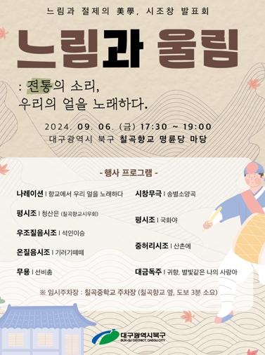 대구 북구청은 오는 9월 6일, 칠곡향교 명륜당 마당에서 ‘시조창 발표회’를 개최한다.